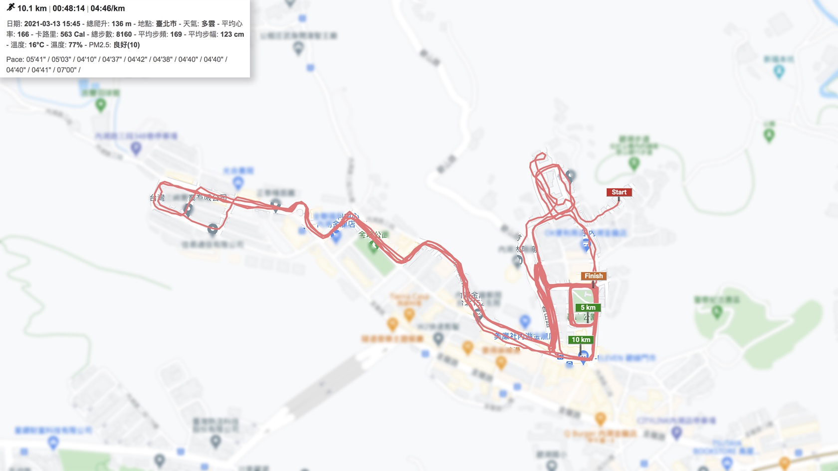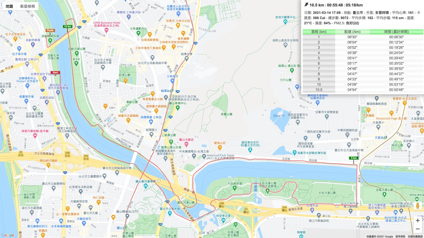 這天的漸速跑我將前幾公里的配速設定較慢,也順便用來做動態暖身。一直到過了大直橋來到明水路一側的長直線路段,才開始加速至目標配速。