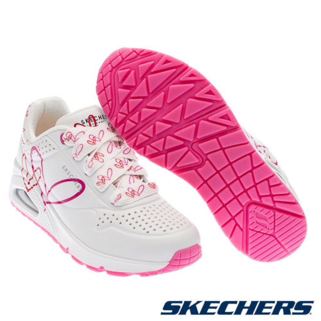UNO系列,街頭時尚氣墊運動鞋。深受年輕人喜愛的國際知名街頭藝術家 James Goldcrown,因其經典代表作彩色愛心塗鴉 Lovewall 而聞名享譽全世界。這次在 Skechers X JGoldcrown 合作中將其標誌性的#Lovewall心形設計帶入鞋款,推出色彩繽紛、個性前衛的聯名鞋款。