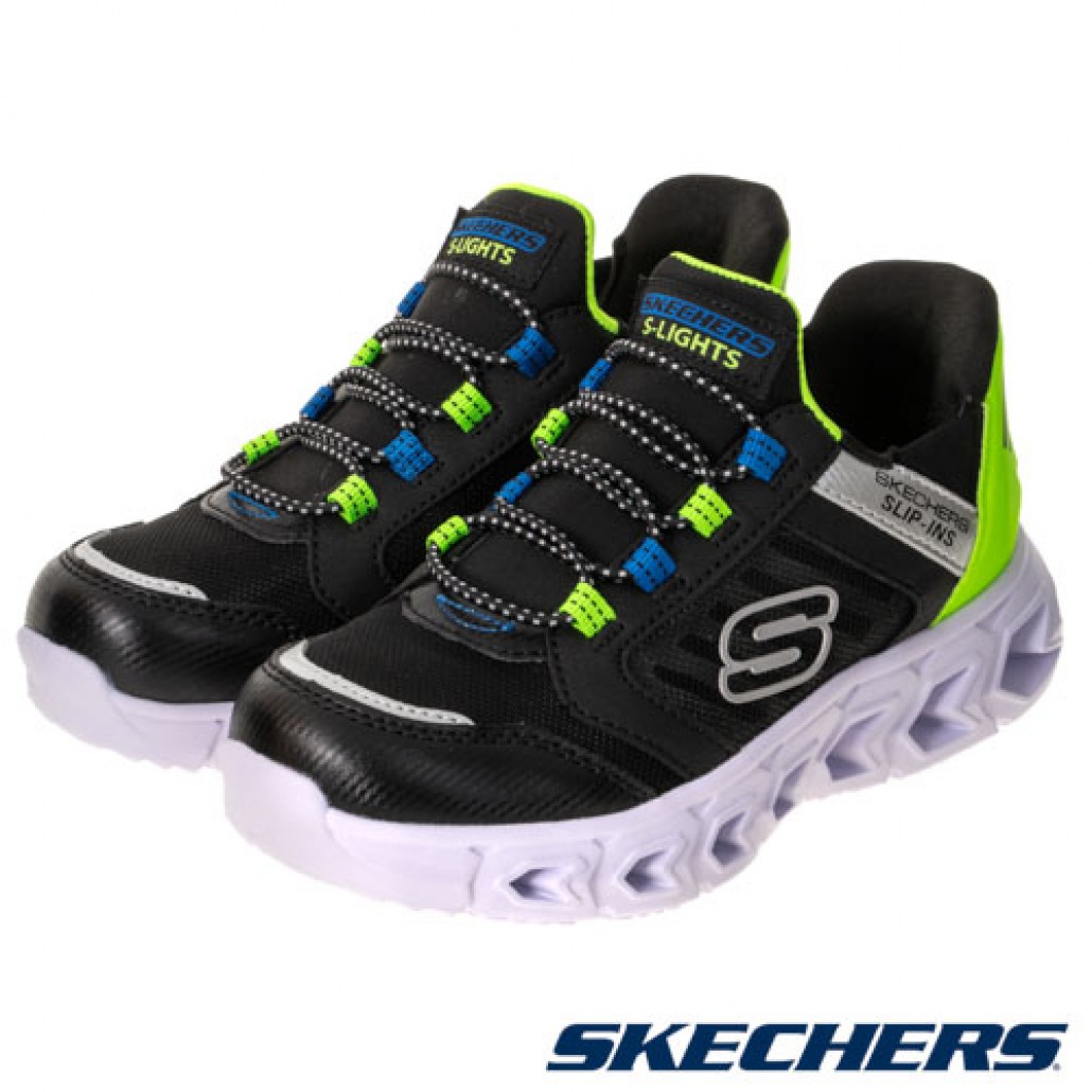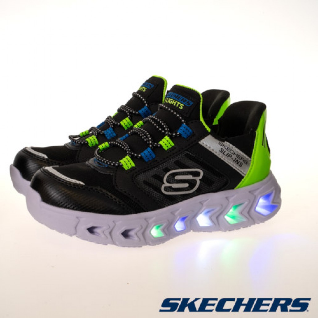 HYPNO-FLASH 2.0 雙色箭頭閃燈鞋系列,輕量套入式運動鞋,搭載SLIP-INS ®瞬穿舒適科技,後套杜邦Hytrel®熱塑性彈性體讓小朋友們站著就能自己輕鬆穿上鞋。