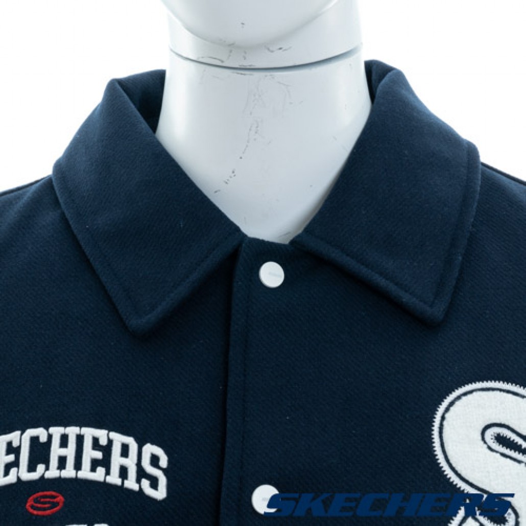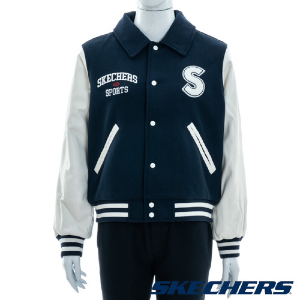 SKECHERS棒球外套,復古撞色袖子皮革拼接,重現美式經典棒球復古風格,簡約有型。 1.復古撞色袖子皮革拼接。 2.立體拼接質感絨布LOGO刺繡。 3.兩側口袋,安全收納物品。 4.袖口及下擺拼接羅紋,增強保暖包覆效果。 5.左胸內側有隱形暗袋,可放置貼身小物。