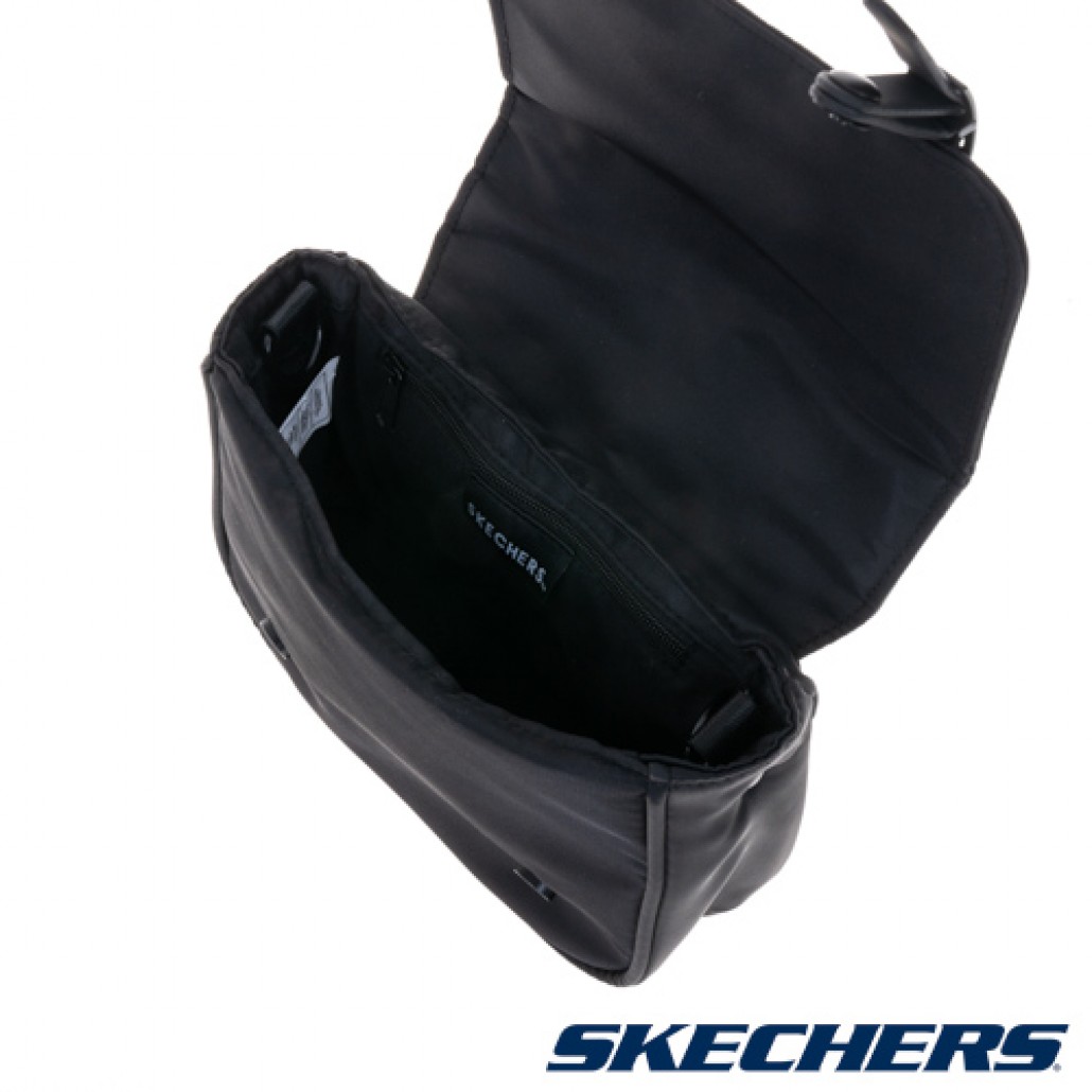 SKECHERS休閒斜背包,輕巧方便,時尚有型,適合日常外出使用。 1.磁釦式翻蓋設計,內層附小拉鍊口袋。 2.後側收納層,取物更方便。 3.金屬質感鑽石LOGO配件,低調有型。