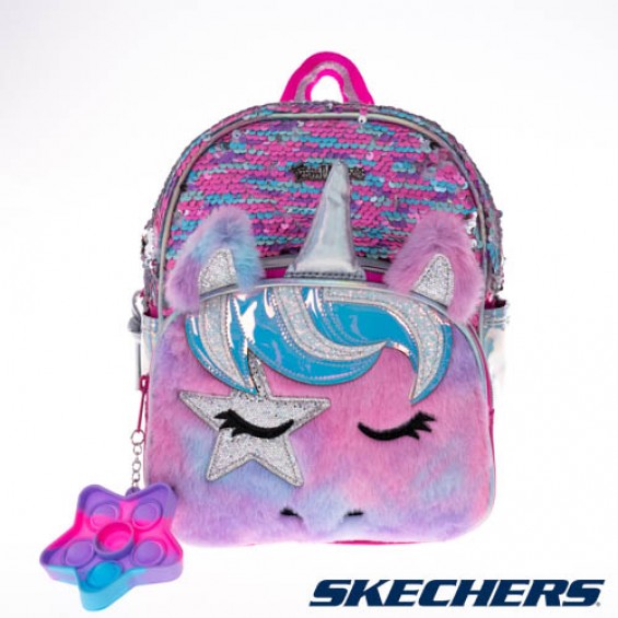 SKECHERS 童後背包,五彩獨角獸配毛絨設計,炫彩可翻面亮片,吸睛亮眼,日常休閒必備單品。 1.可翻面彩虹亮片,十足吸睛。 2..絨毛獨角獸,俏皮可愛。 3. 雙拉鍊頭收納夾層,方便收納小物件。 4. 可調整式舒適肩背,依照個人背負舒適度做調整。