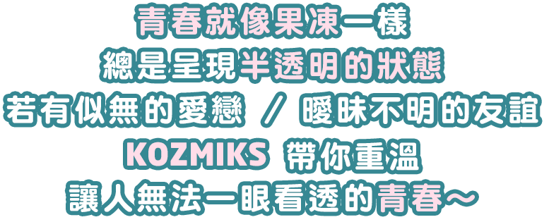 青春就像果凍一樣 總是呈現半透明的狀態 若有似無的愛戀 / 曖昧不明的友誼 KOZMIKS 帶你重溫讓人無法一眼看透的青春~