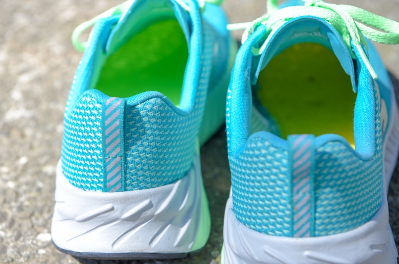 這次拿到的是 tiffany 色,鞋子外觀以最有春天氣息的 tiffany 色為主體,搭配有夜間反光功能的大 S 廠牌 LOGO,多處反光設計,加強晨間與夜跑的安全性。鞋底顏色外側為全白色、內側為粉綠色,跳色的設計感增添它的獨特感。