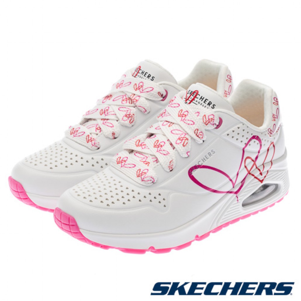 UNO系列,街頭時尚氣墊運動鞋。深受年輕人喜愛的國際知名街頭藝術家 James Goldcrown,因其經典代表作彩色愛心塗鴉 Lovewall 而聞名享譽全世界。這次在 Skechers X JGoldcrown 合作中將其標誌性的#Lovewall心形設計帶入鞋款,推出色彩繽紛、個性前衛的聯名鞋款。