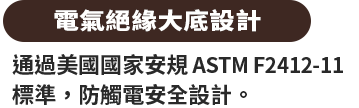 通過美國國家安規 ASTM F2412-2011 標準,防止觸電安全設計。