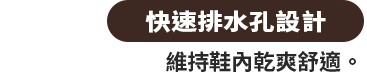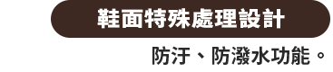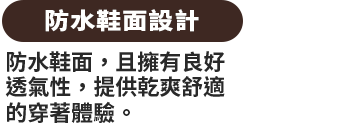 防水鞋面,且擁有良好透氣性,提供乾爽舒適的穿著體驗。
