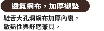 鞋舌大孔洞網布加厚內裏,散熱性與舒適兼具。