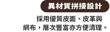 採用優質皮面、皮革與網布,層次豐富亦方便清理。