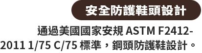 通過美國國家安規 ASTM F2412- 2011 1/75 C/75 標準,鋼頭防護鞋設計。