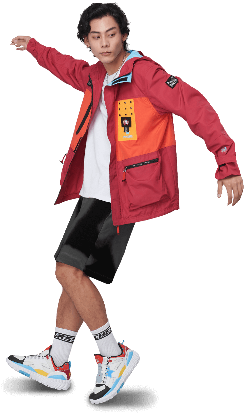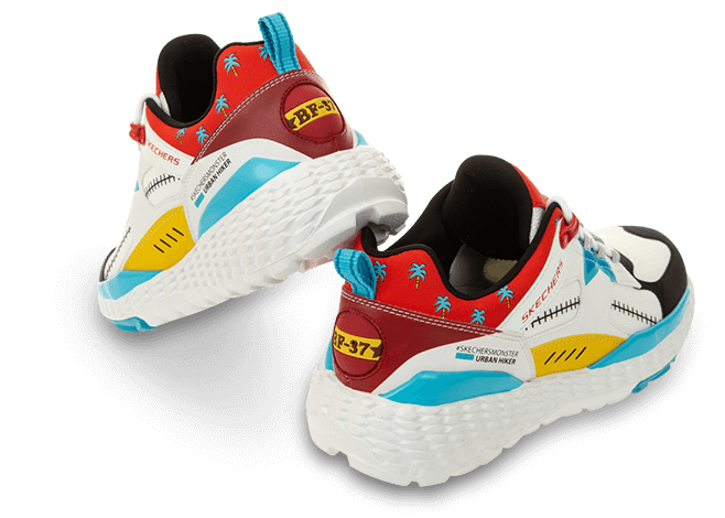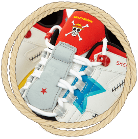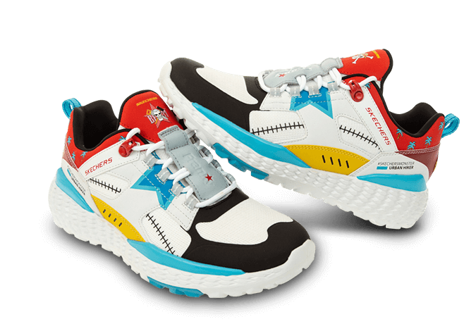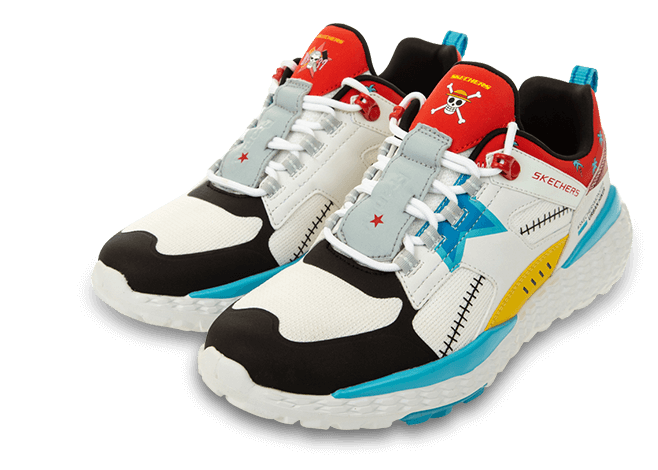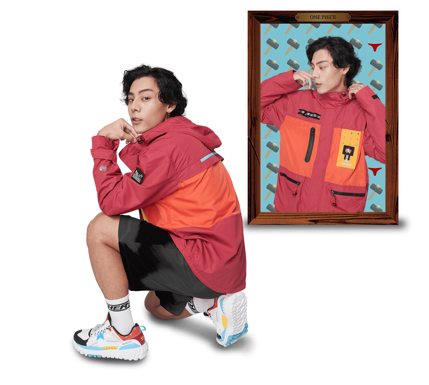 SKECHERS X 航海王聯名款以“BE MY CREW 成為我的船員” 為主題,根據佛朗基特色及造型,設計不同象徵性圖案並搭配都市戶外休閒風格的服裝概念,增加服裝的實用性及設計感。