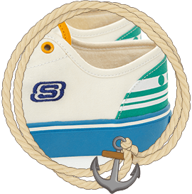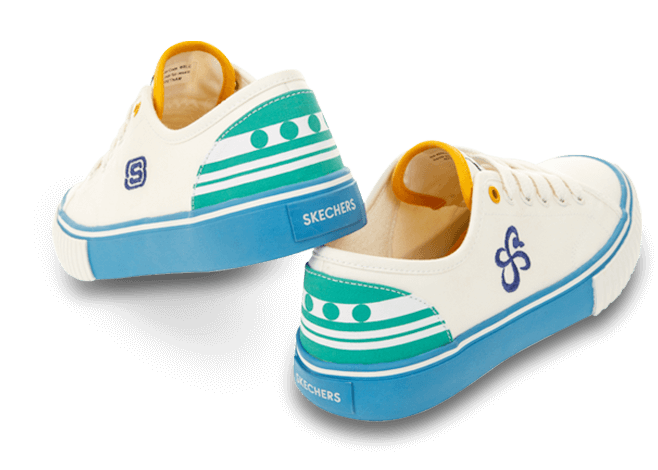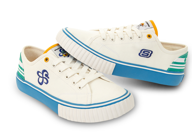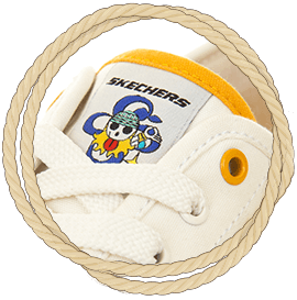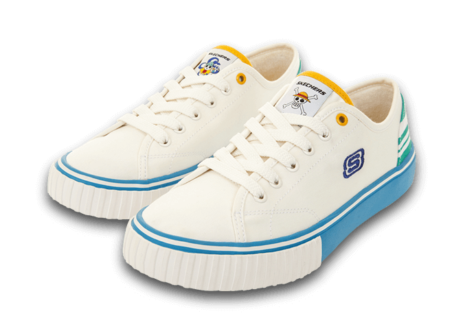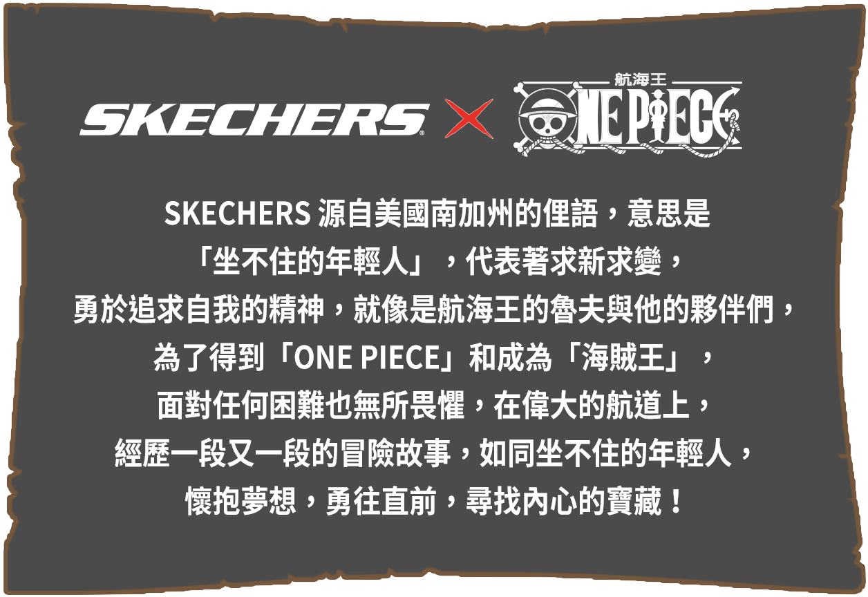 SKECHERS 源自美國南加州的俚語,意思是「坐不住的年輕人」,代表著求新求變,勇於追求自我的精神,就像是航海王的魯夫與他的夥伴們,