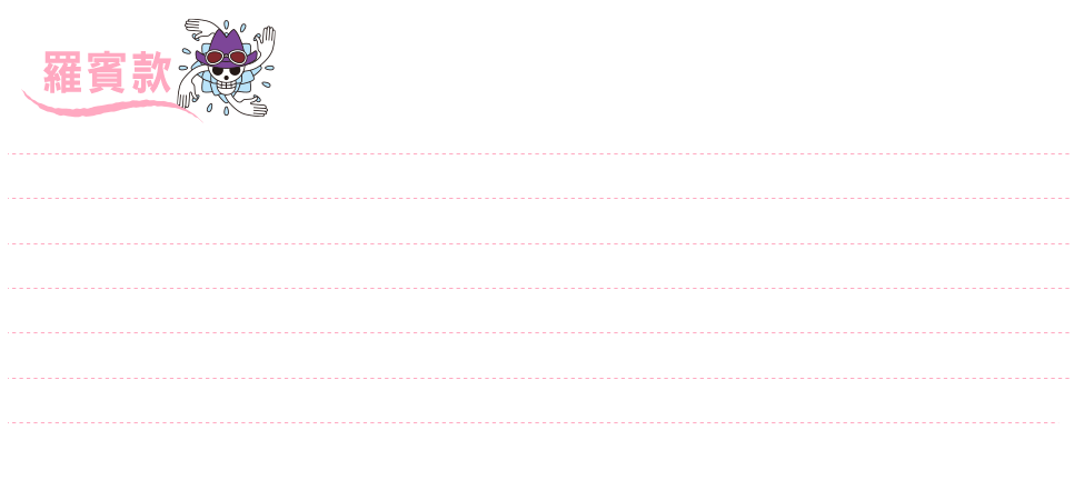 魯夫的第六位夥伴,草帽海賊團隊的考古學家,也是唯一女性的果實能力者。設計師取用羅賓的著裝做發想,運用粉紅色的帆布鞋面與後跟的花朵圖案展現她的流速長裙,鞋頭使用海軍藍皮革拉鍊背心一路延伸至鞋舌, 黑色秀髮整片覆蓋於鞋舌內側延伸至邊緣,鞋舌上的「骷髏頭海賊旗幟」更是帶著羅賓標誌性的牛仔帽,並以宛如開花般長出手的圖案來表現她的「花花果實」能力,鞋後以花瓣裝飾,展現其迷人魅力。綠色鞋墊印上 SKECHERS 與ONE PIECE 聯名 LOGO,讓你踏出的每一步,都能徹底釋放海賊的氣勢與態度!
