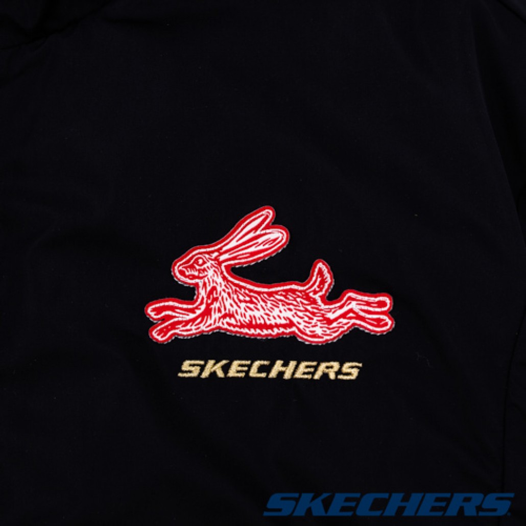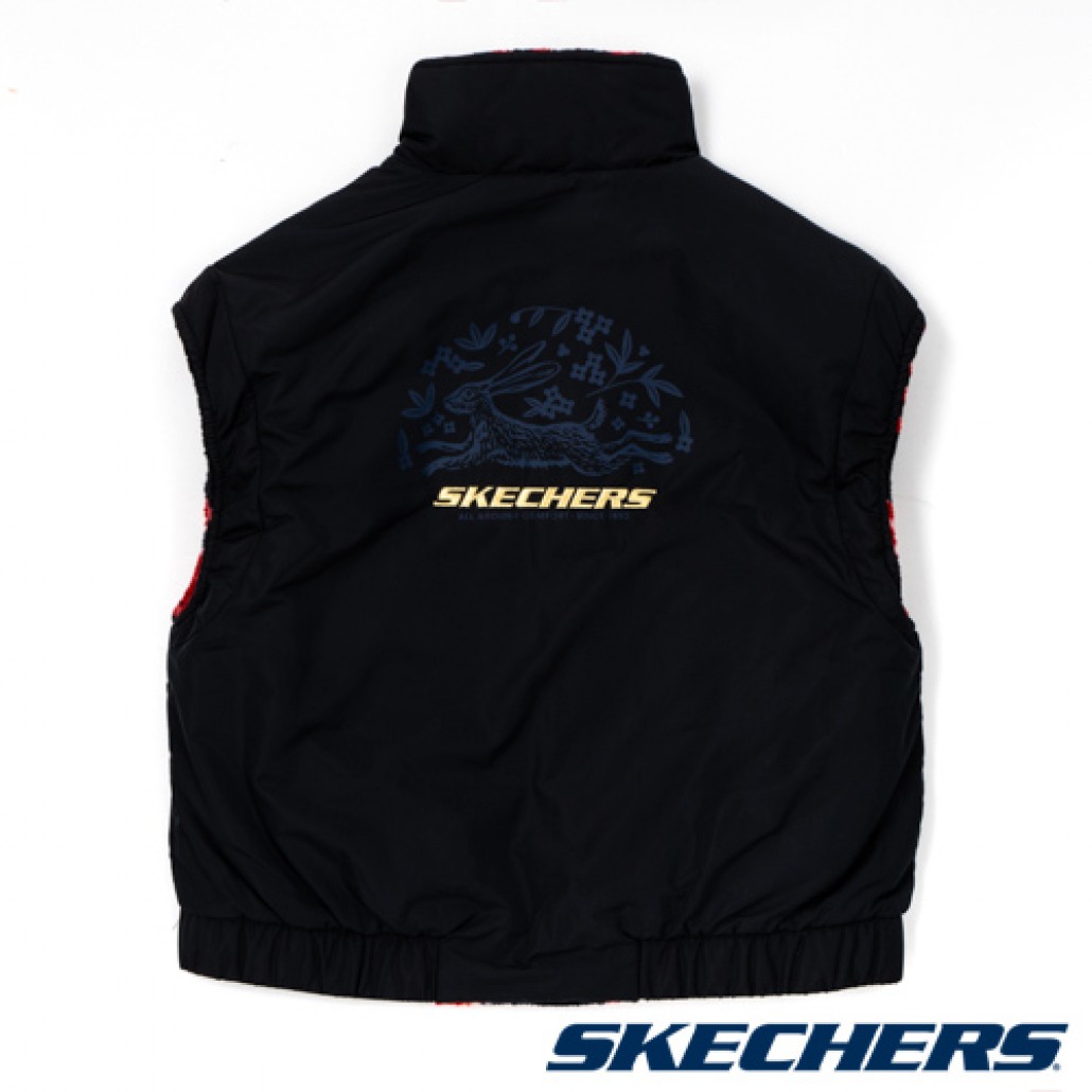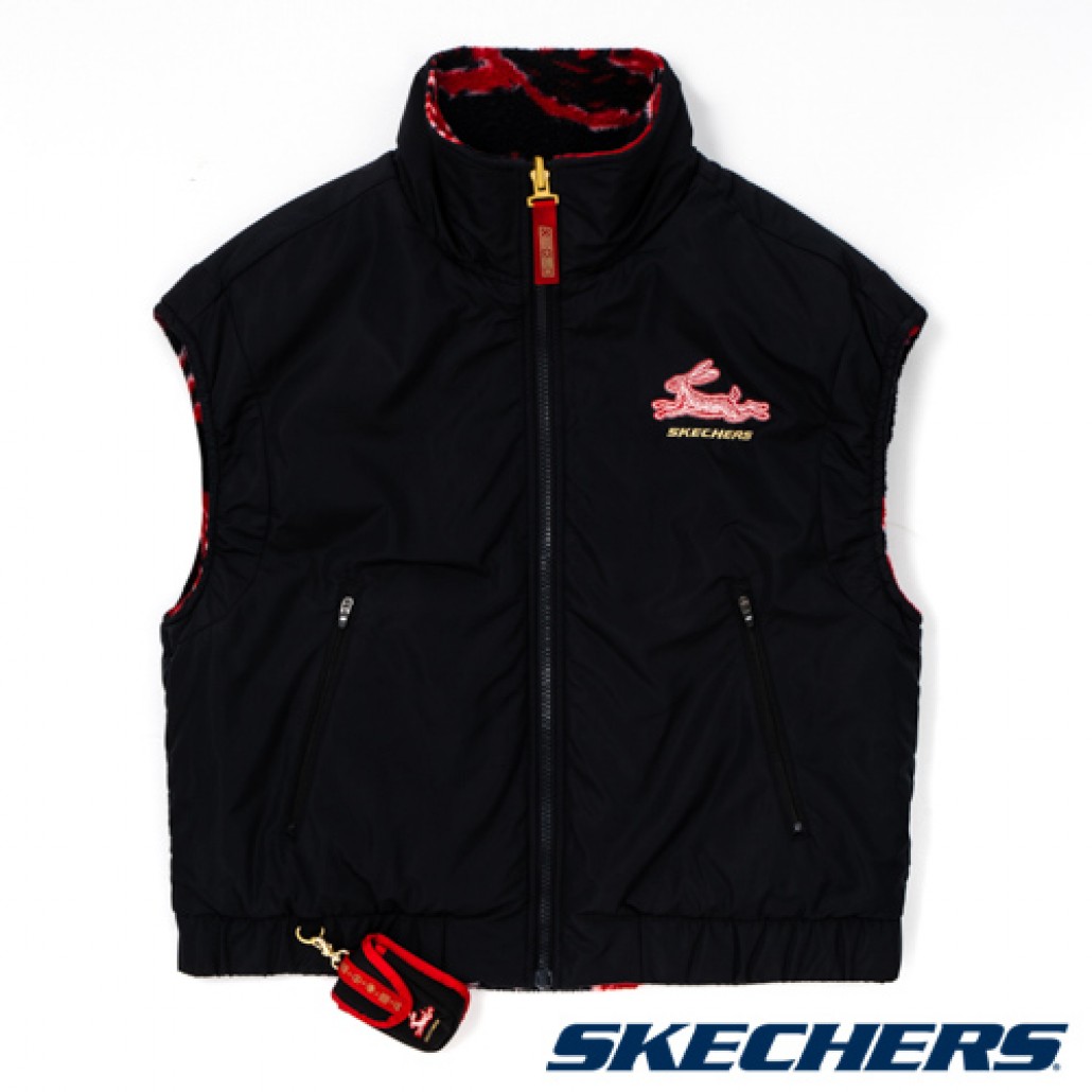 SKECHERS雙面穿拉鍊背心,:精緻兔印圖搭配金色刺繡品牌LOGO,可拆卸小包,搭配兔年節慶元素設計,潮流有型。