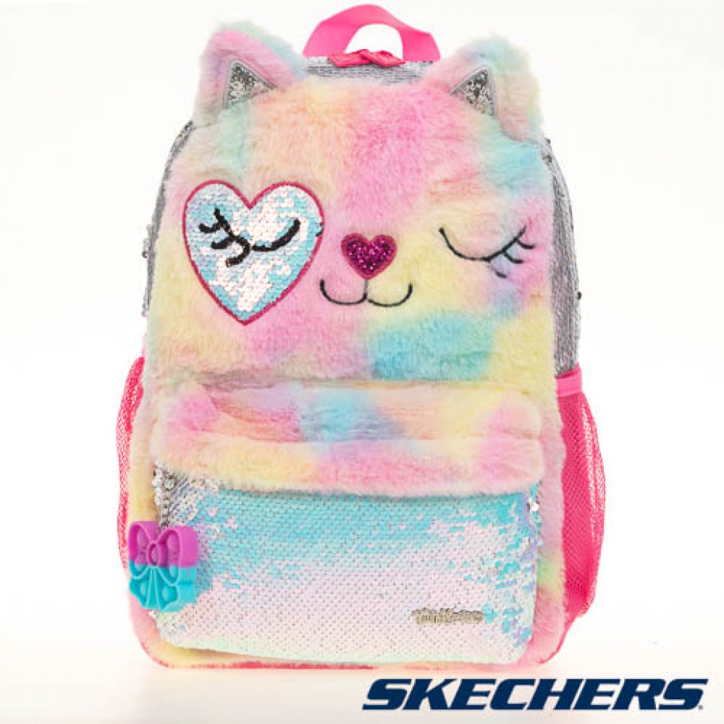 SKECHERS 童後背包,軟萌貓咪搭配POP-IT拉鏈頭設計,炫彩可翻面亮片,吸睛亮眼,日常休閒必備單品。 1.可翻面彩虹亮片,十足吸睛。 2.絨毛微笑貓咪主題設計,萌度爆表。 3. 雙拉鍊頭收納夾層和兩側網袋,方便收納小物件。 4. 前袋拉鍊頭搭配POP-IT拉鏈頭設計,超萌可愛。 5. 可調整式舒適肩背,依照個人背負舒適度做調整。